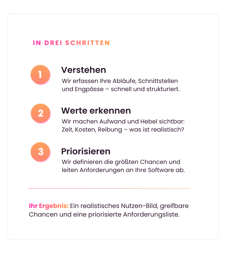 Mit einem strukturierten Analyseansatz machen wir sichtbar, wo unnötiger Aufwand entsteht, Prozesse vereinfacht werden können und Business Software messbar entlastet.