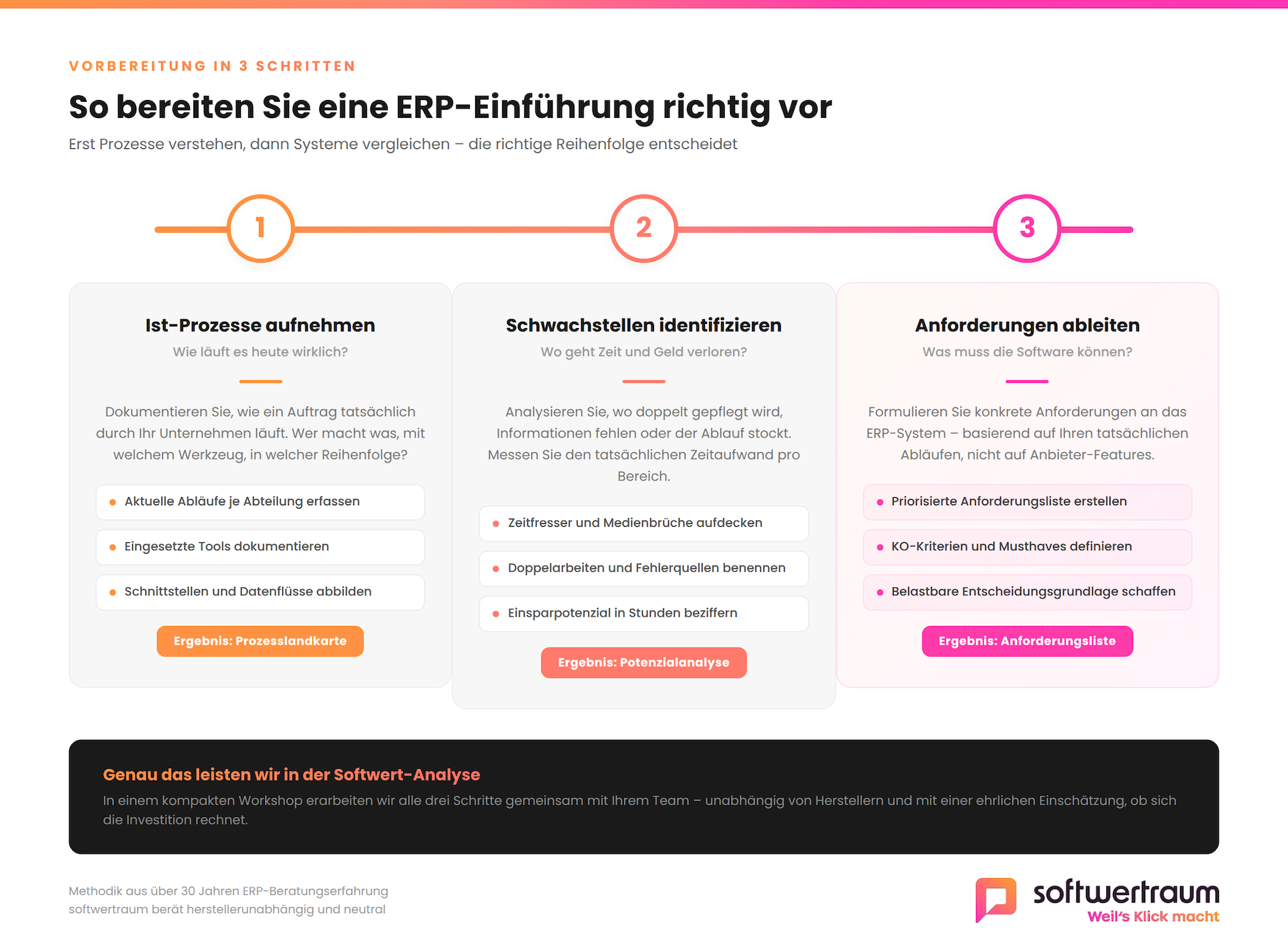Wenn Sie zwei oder mehr Fragen mit Nein beantworten, lohnt sich eine strukturierte Analyse. In unserer Softwert-Analyse erarbeiten wir in einem kompakten Workshop die Grundlagen, die eine erfolgreiche ERP-Einführung braucht. Unabhängig, faktenbasiert und mit einer ehrlichen Empfehlung.