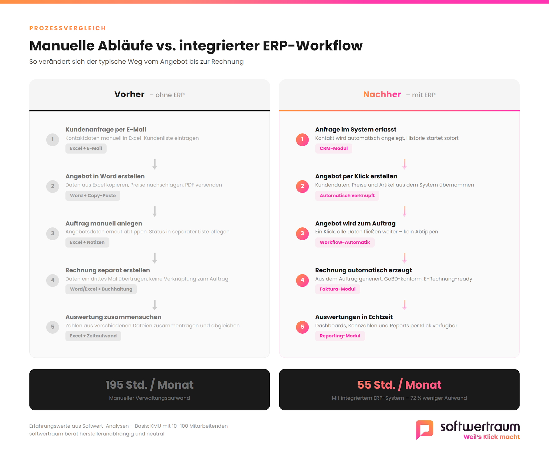 Bei einem Stundensatz von 65 EUR entspricht das einer monatlichen Ersparnis von rund 9.100 EUR. Erfahrungsgemäß amortisiert sich die Investition innerhalb von 12 bis 24 Monaten. Wer verschiedene ERP-Systeme für diese Bereiche vergleichen möchte, findet in unserem ERP-Vergleich 2026 eine aktuelle Gegenüberstellung.